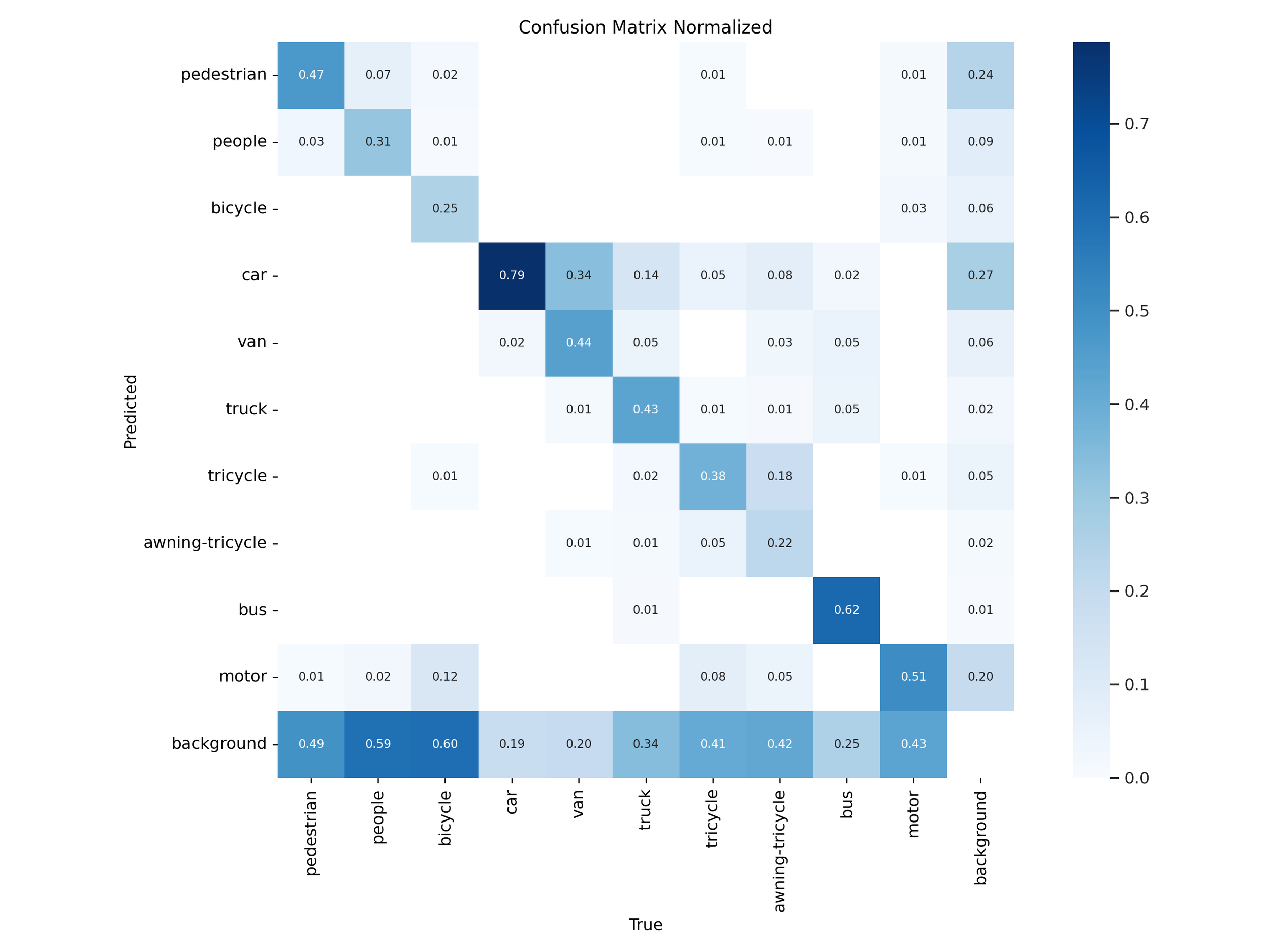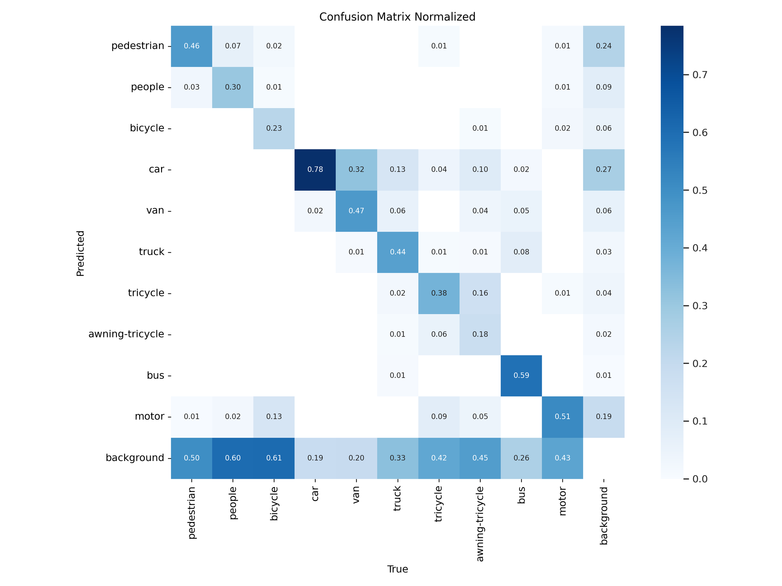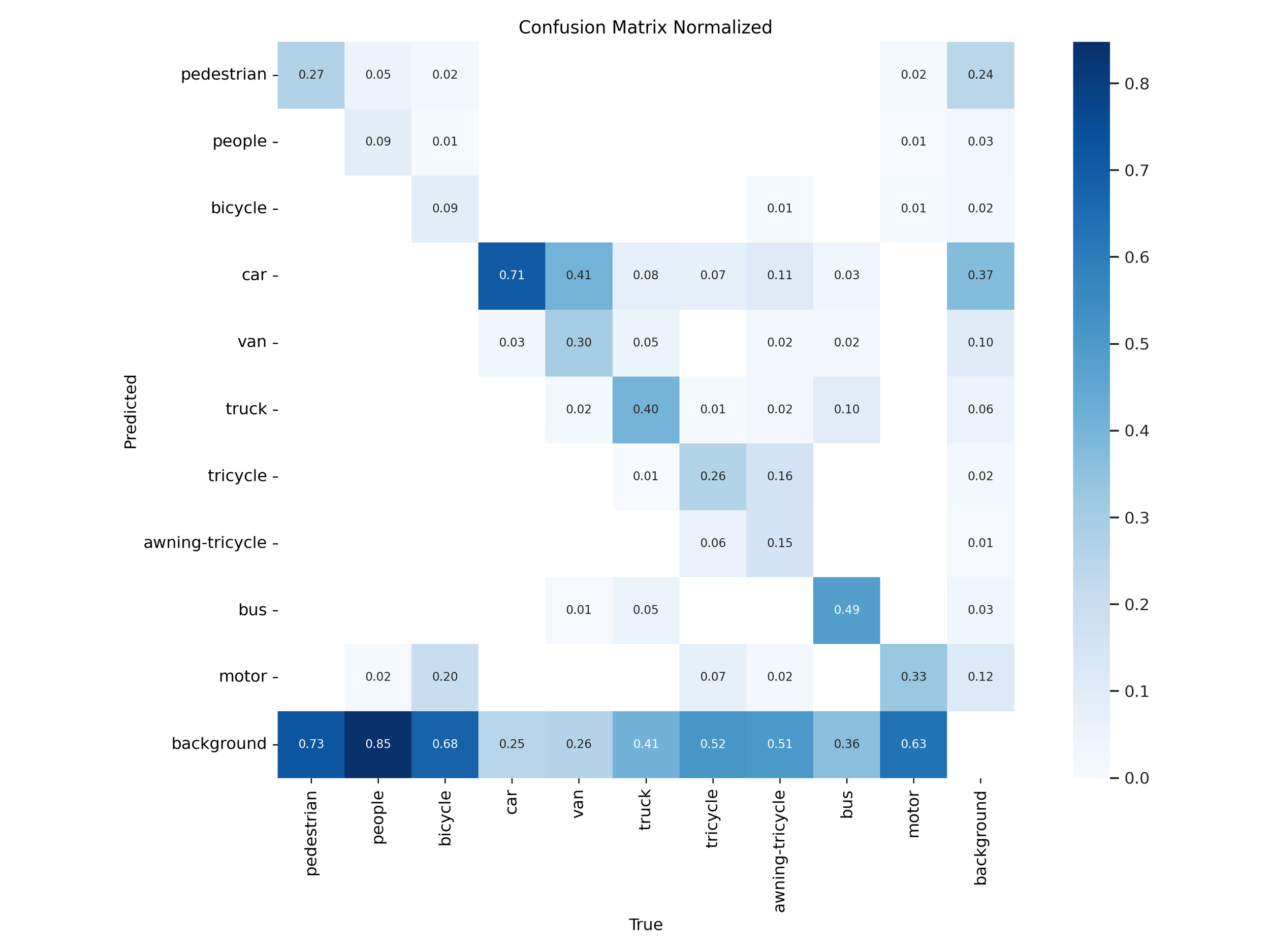 Normalized confusion matrices revealed that YOLOv11 handled common classes like car, bus, and pedestrian more accurately in both “s” and “x” tiers. YOLOv12 models showed slight improvements on rare classes like awning-tricycle, but this came at the expense of higher misclassification rates across more frequently occurring objects.