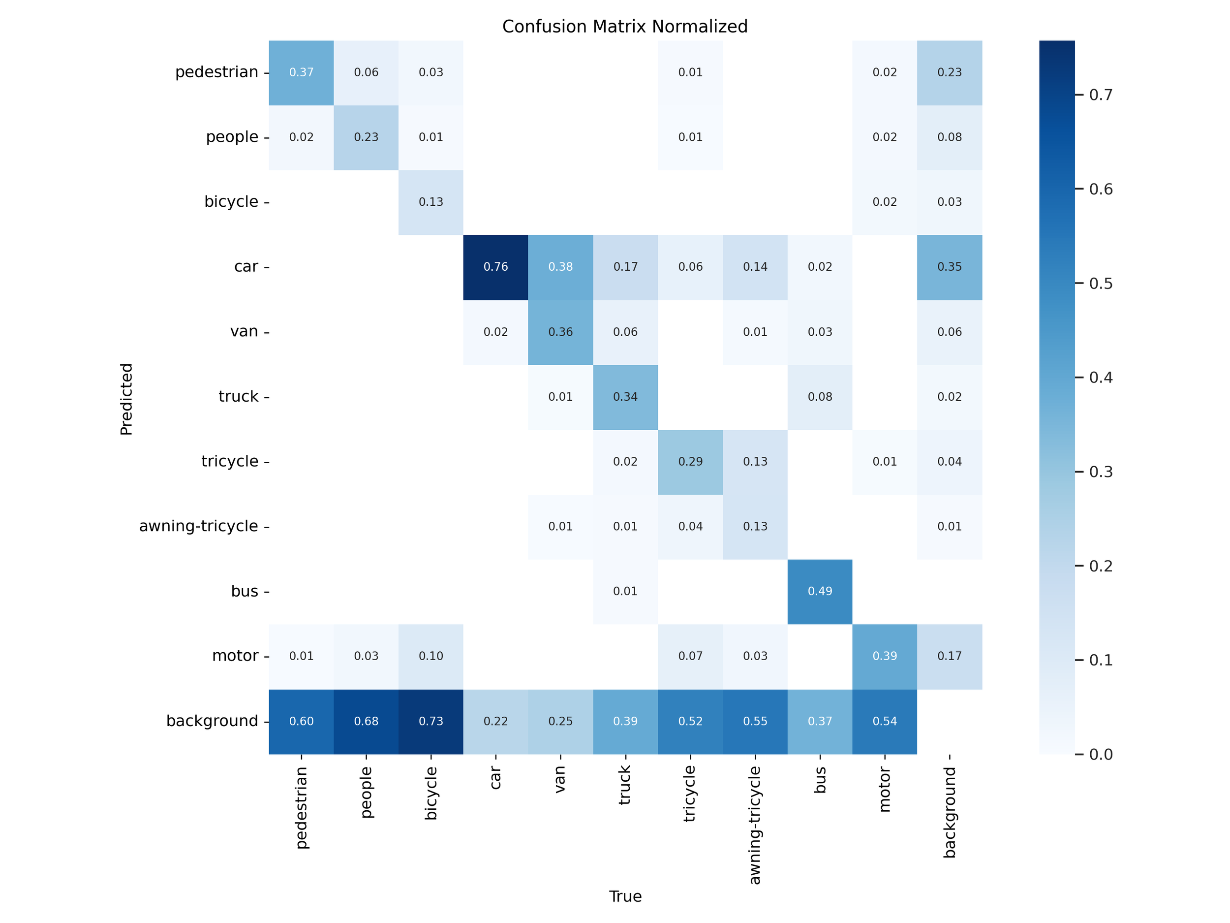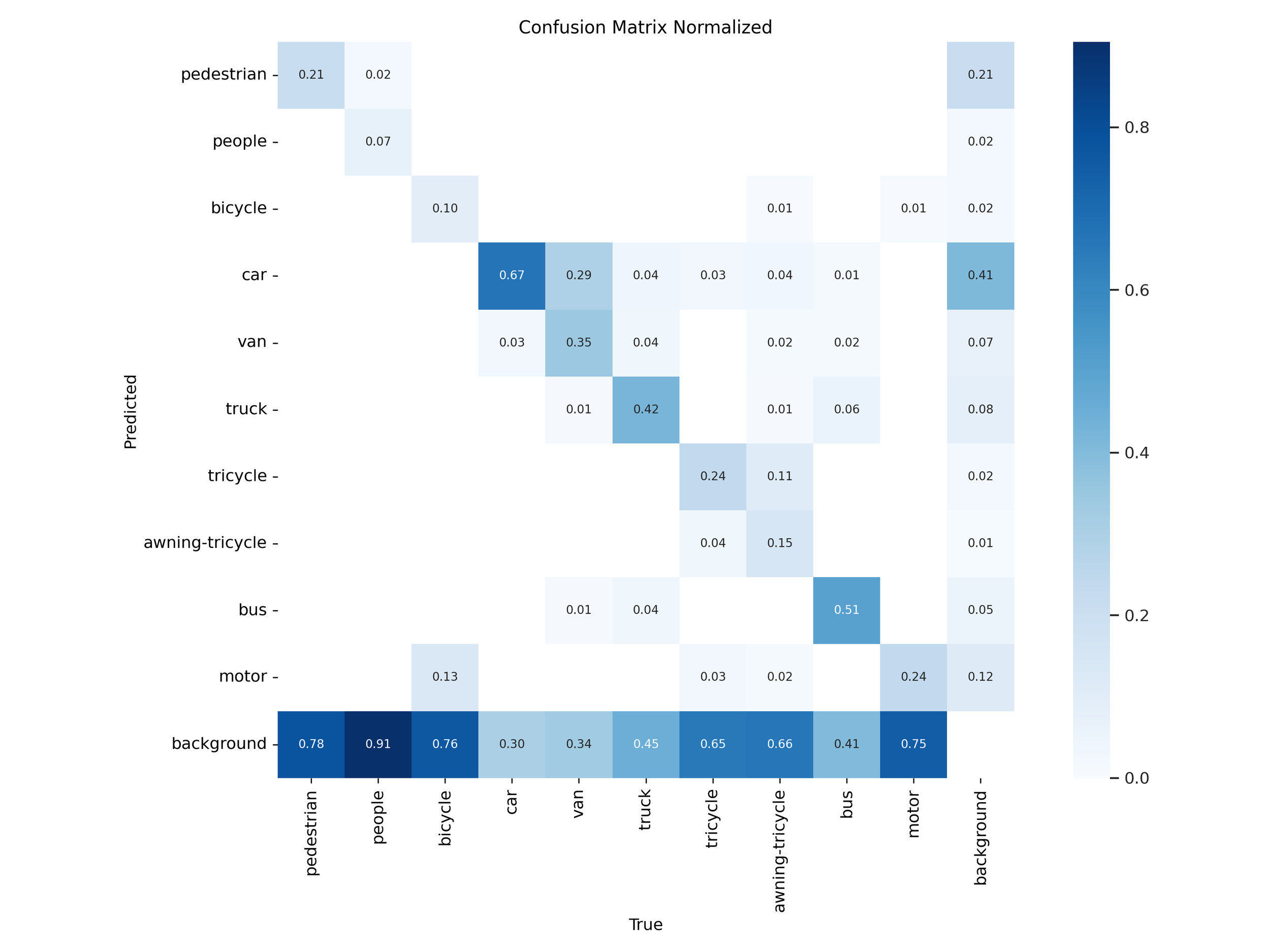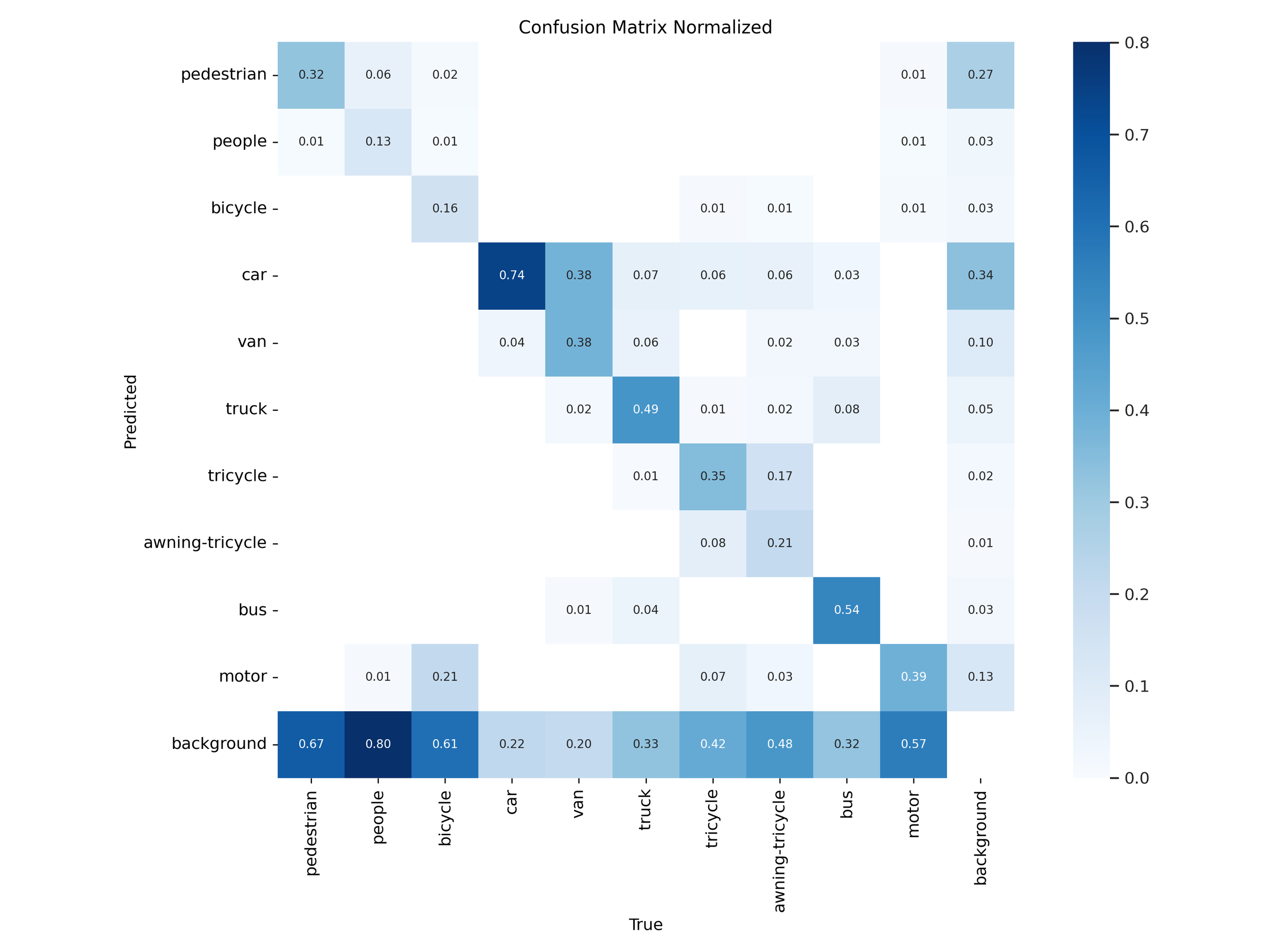 Normalized confusion matrices revealed that YOLOv11 handled common classes like car, bus, and pedestrian more accurately in both “s” and “x” tiers. YOLOv12 models showed slight improvements on rare classes like awning-tricycle, but this came at the expense of higher misclassification rates across more frequently occurring objects.