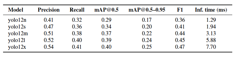 Table 2 – Overall detection performance for the YOLOv12 family on VisDrone
