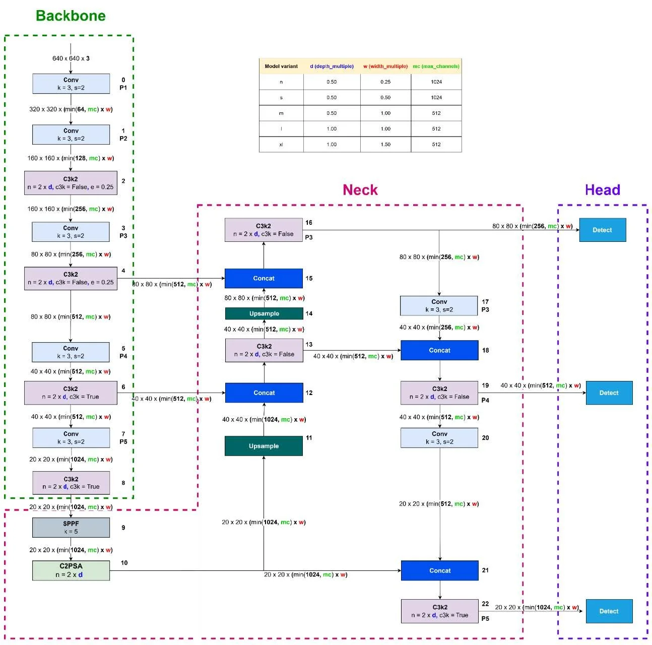 C3k2: A lightweight variant of the C3 block used in the backbone. It reduces complexity by splitting and partially routing features through bottleneck layers. This improves spatial representation while maintaining fast inference, especially in lower-capacity models.